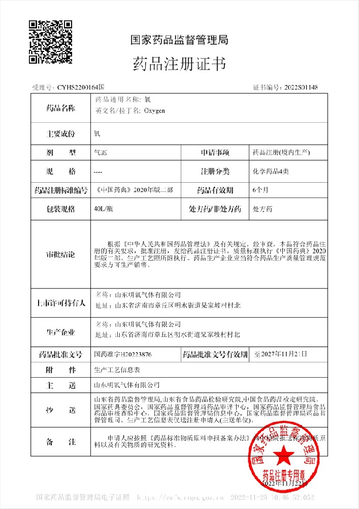 2022年12月取得國家藥品監(jiān)督管理局頒的藥品注冊證書,醫(yī)用氧項(xiàng)目正式投入生產(chǎn)